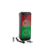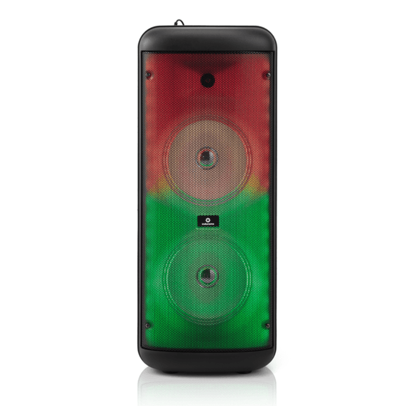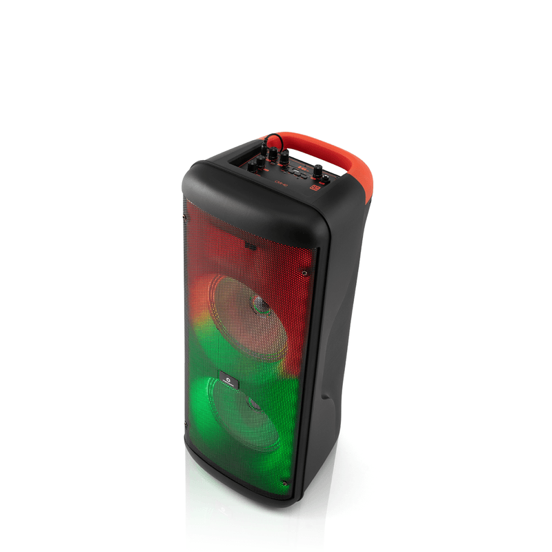 Dos woofers de 8" + tweeter 10 W; luces LED RGB dinámicas; Bluetooth 5.3 hasta 10 m; batería interna recargable; entradas para micrófono y guitarra; control remoto incluido